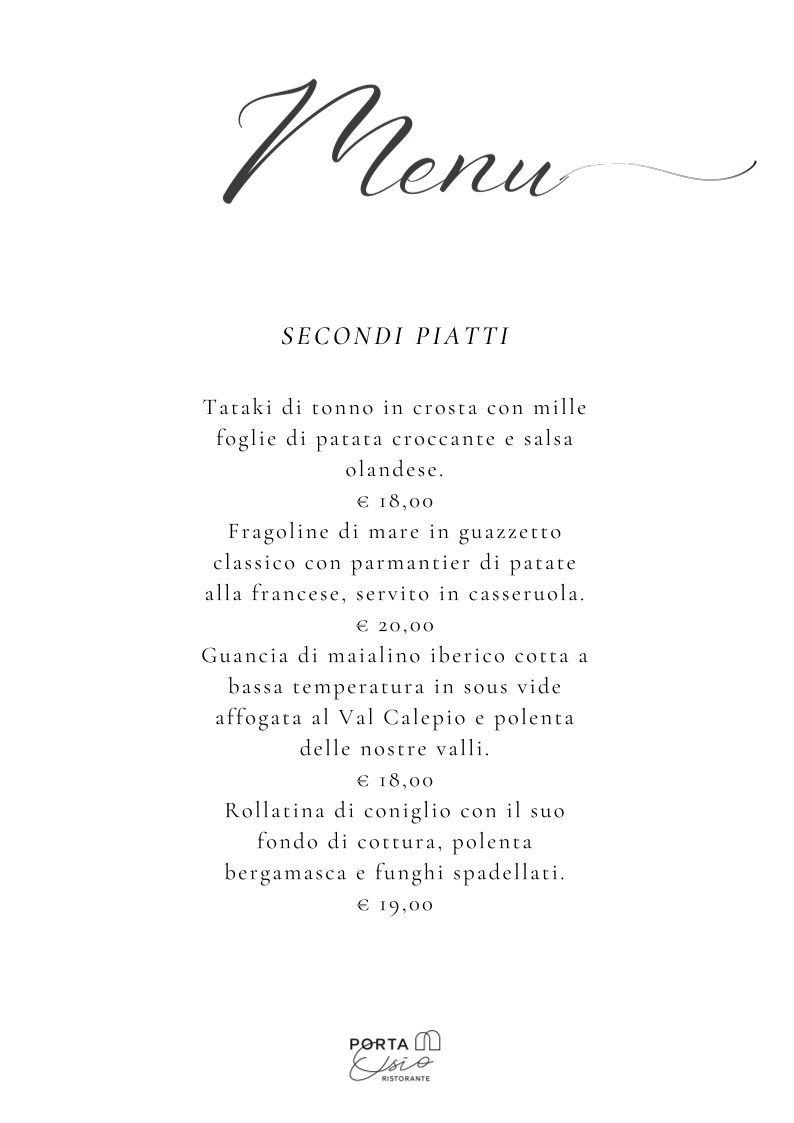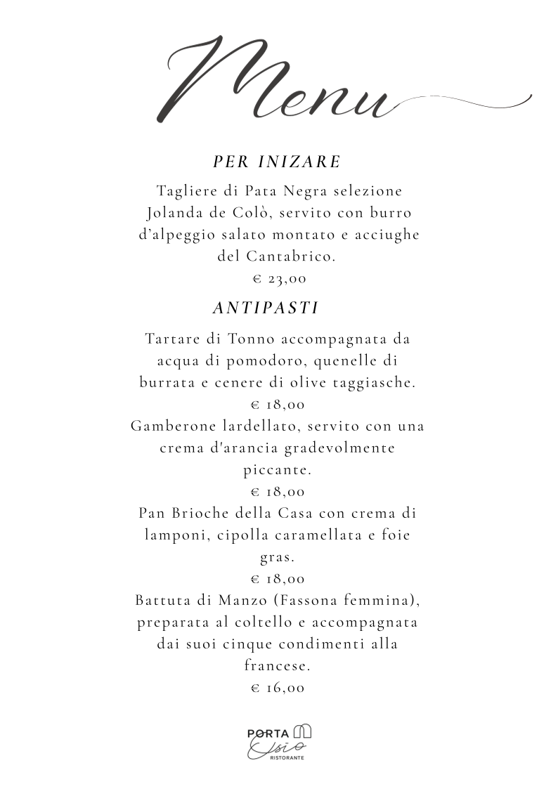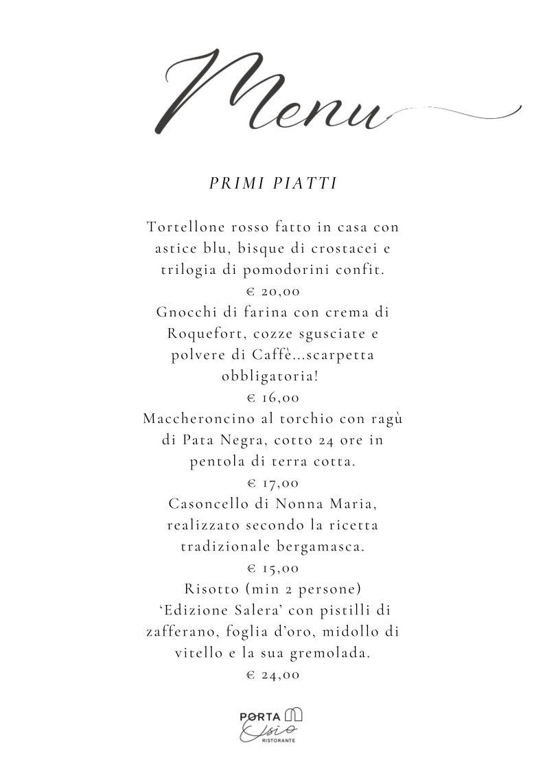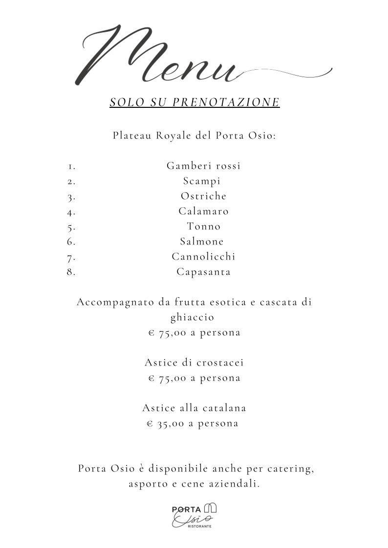 From a reviewer’s perspective, the menu at Ristorante Enoteca Porta Osio offers a refined and thoughtfully curated selection that balances tradition and creativity, even though prices are not explicitly listed. The experience begins elegantly with Tagliere di Pata Negra selezione Jolanda de Colò, setting a high standard for quality. Among the appetizers, standout choices like Tartare di Tonno, Gamberone lardellato, and Battuta di Manzo (Fassona femmina) highlight both freshness and craftsmanship. The first courses continue to impress with house-made specialties such as Tortellone rosso fatto in casa, Gnocchi di farina, Maccheroncino al torchio, and the traditional Casoncello di Nonna Maria, while the Risotto (min 2 persone) “Edizione Salera” adds a touch of exclusivity. Main dishes like Tataki di tonno in crosta, Fragoline di mare in guazzetto classico, and Guancia di maialino iberico showcase a sophisticated approach to both seafood and meat, complemented by options like Rollatina di coniglio. To finish, desserts such as Il nostro tiramisù, Catalana Flambé, and Fondue di cioccolato provide a satisfying and indulgent conclusion. For those seeking something truly special, reservation-only dishes like Plateau Royale del Porta Osio and Astice alla catalana elevate the menu further, making it clear that this restaurant is dedicated to delivering a memorable and upscale dining experience.